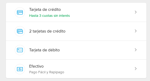 5. Luego, te direccionará hacia la siguiente pestaña, una vez acá, podes modificar el metodo de pago y podes elegír una de las siguientes formas de pago: