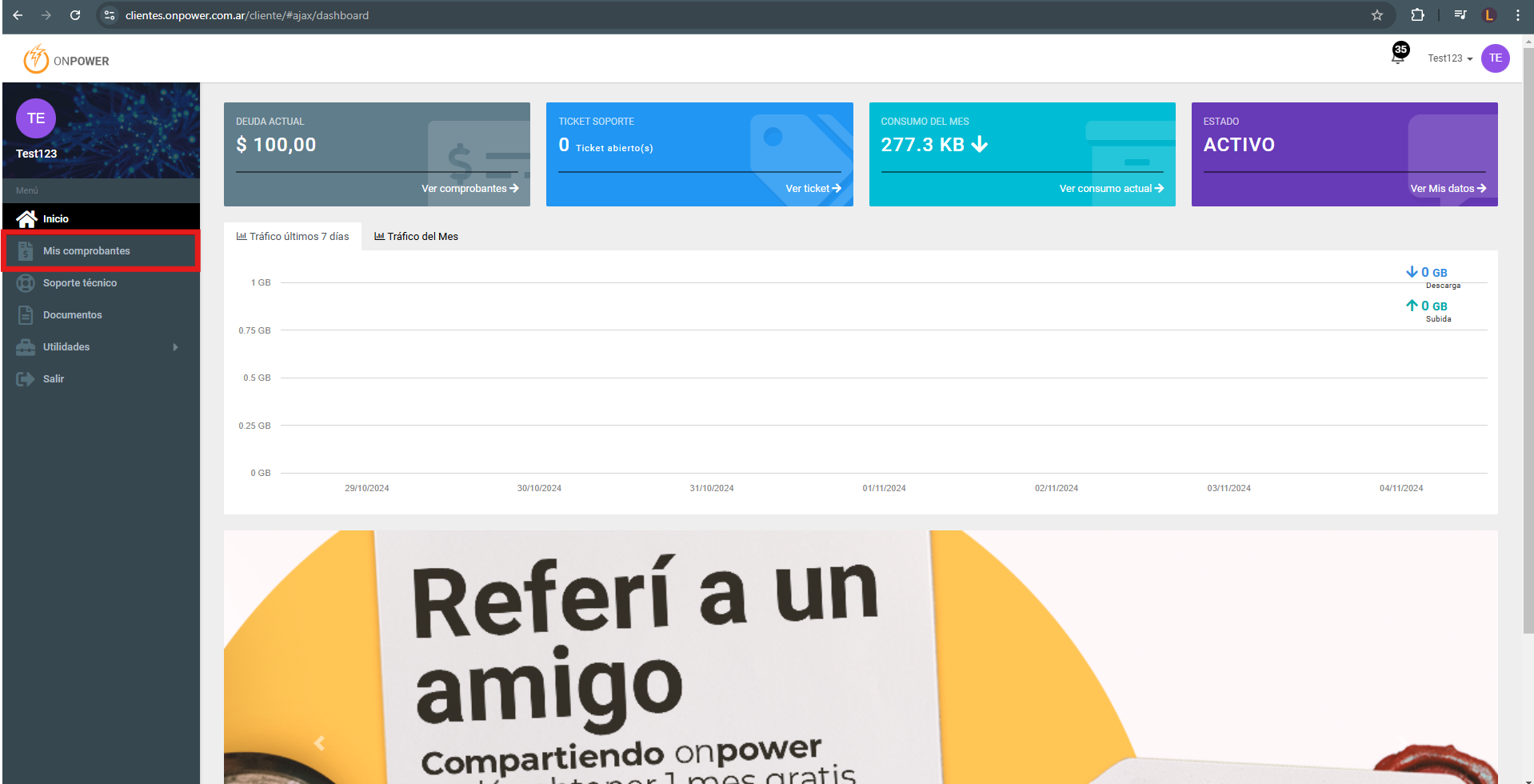 2. Una vez ingresado, verás en el panel la siguiente imágen, ahí te diriges a "Mis comprobantes":