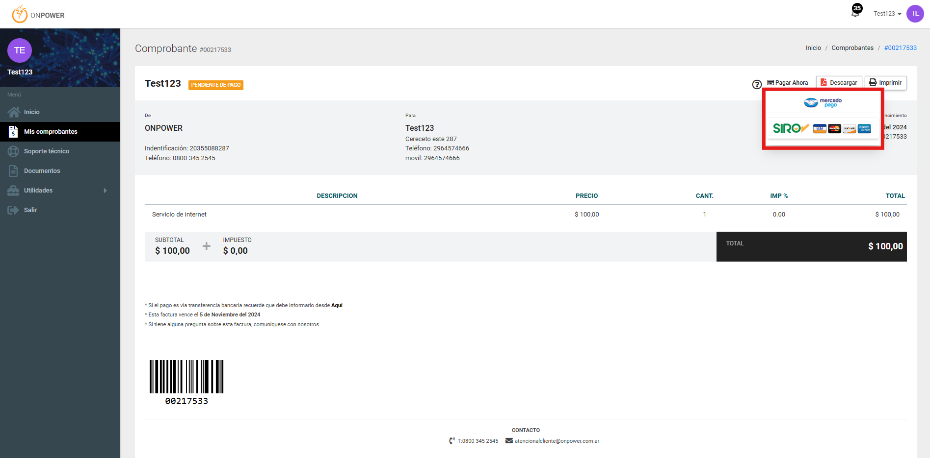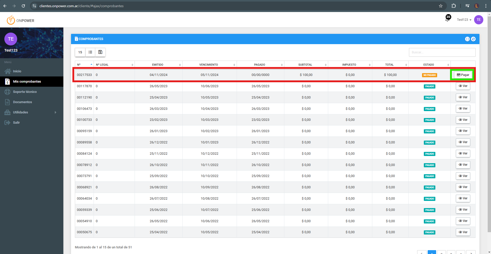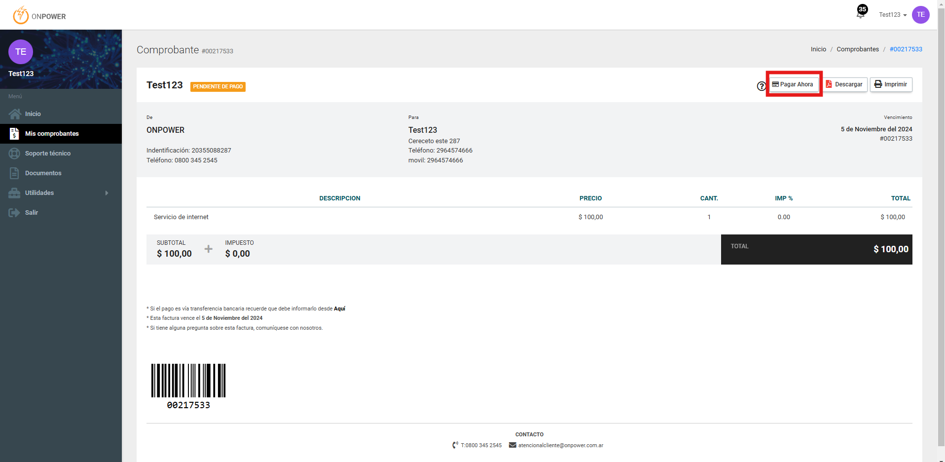 3. Una vez que están disponibles los comprobantes, verás una factura no pagada, vas a hacer click en "Pagar", y te enviará a otra pestaña de “Comprobante”: