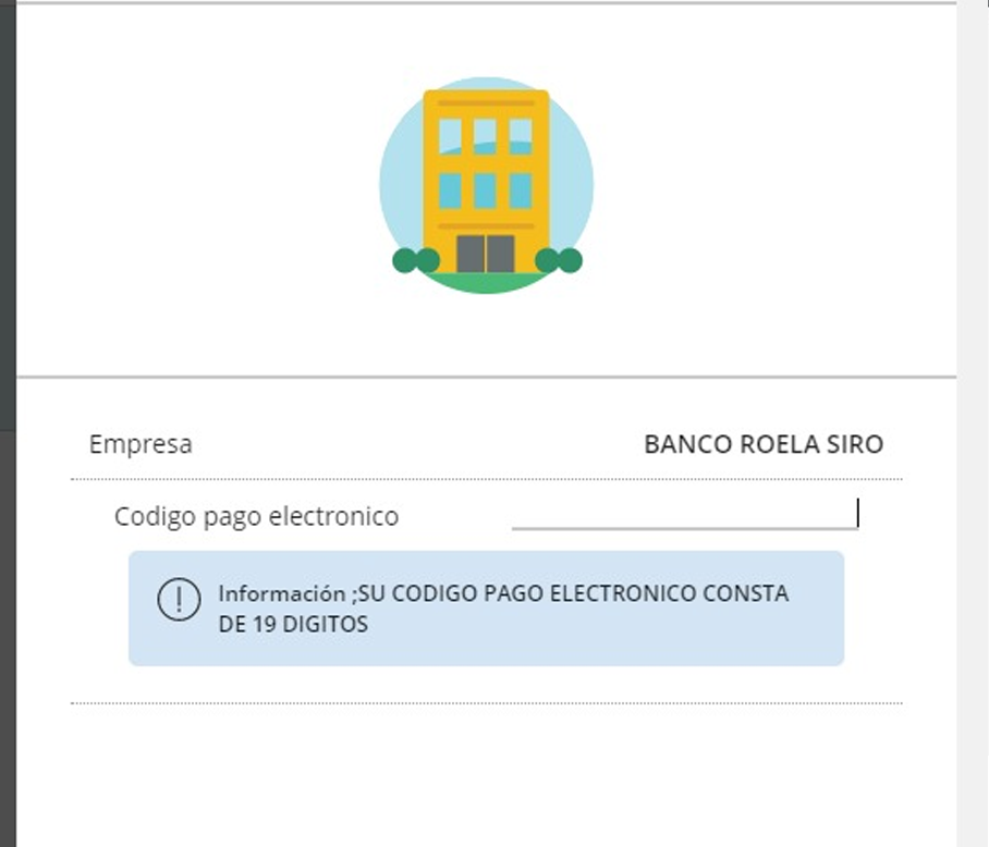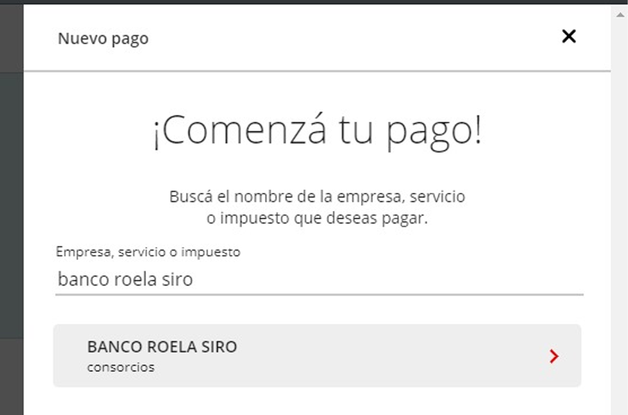 3. Nos dirigimos al homebanking y colocaremos "Banco Roela Siro" en el apartado de Empresa, servicio o impuesto y daremos siguiente.