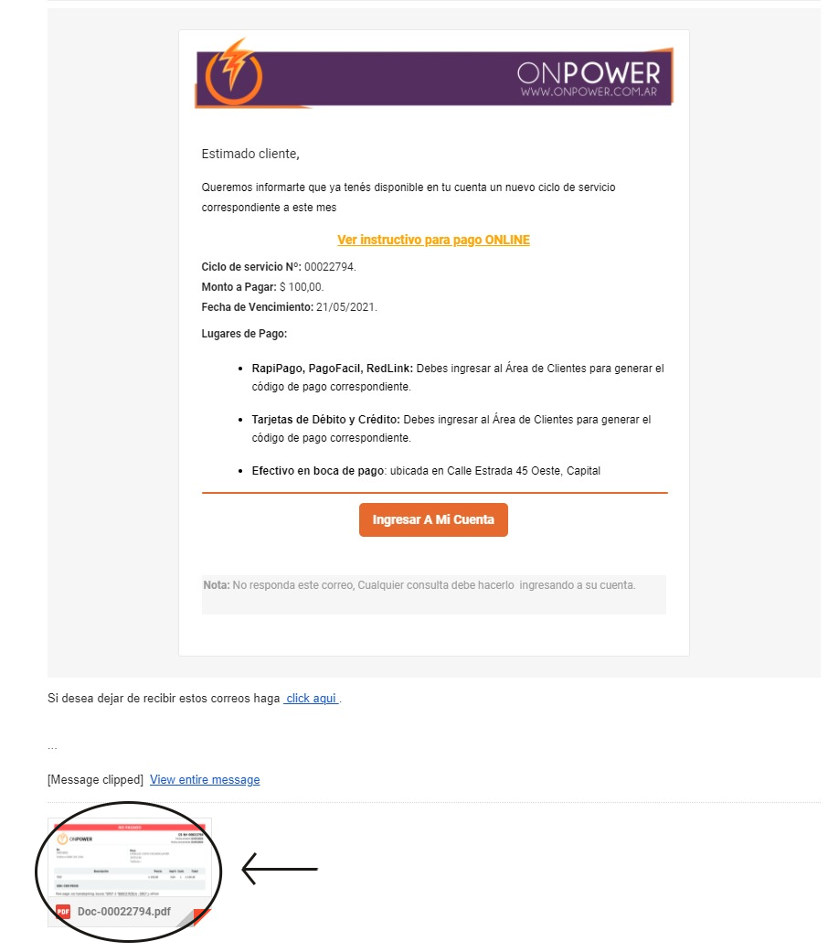 1. Dirigite a tu correo y selecciona la factura generada que quieras pagar. Una vez ingresado, en los archivos adjuntos verás un archivo PDF, haz click en el.