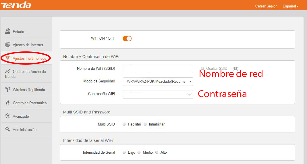 - Ingresar a "Ajustes Inalámbricos", en el apartado "Nombre y Contraseña de WiFi":